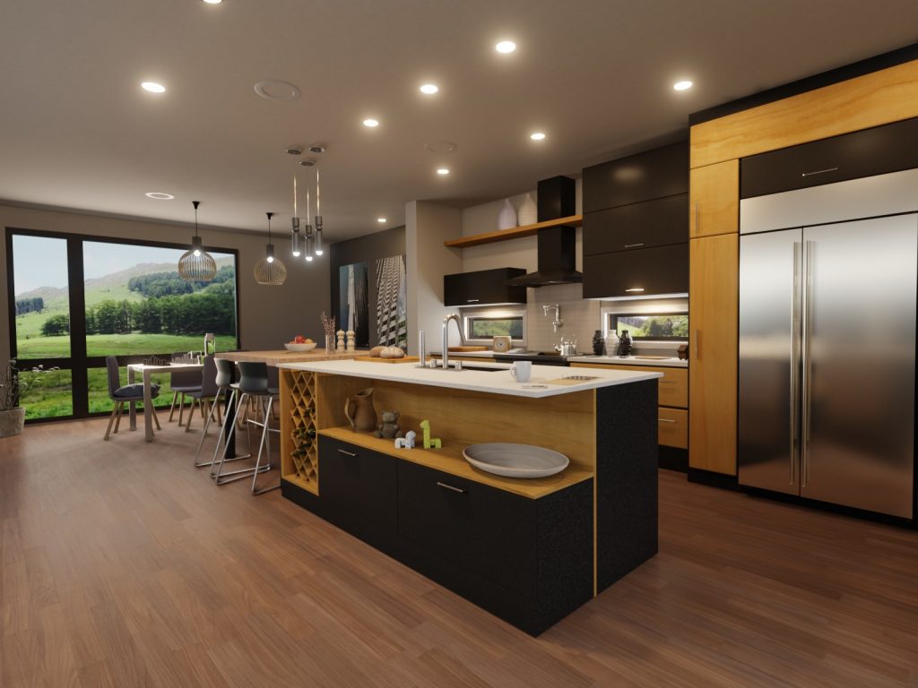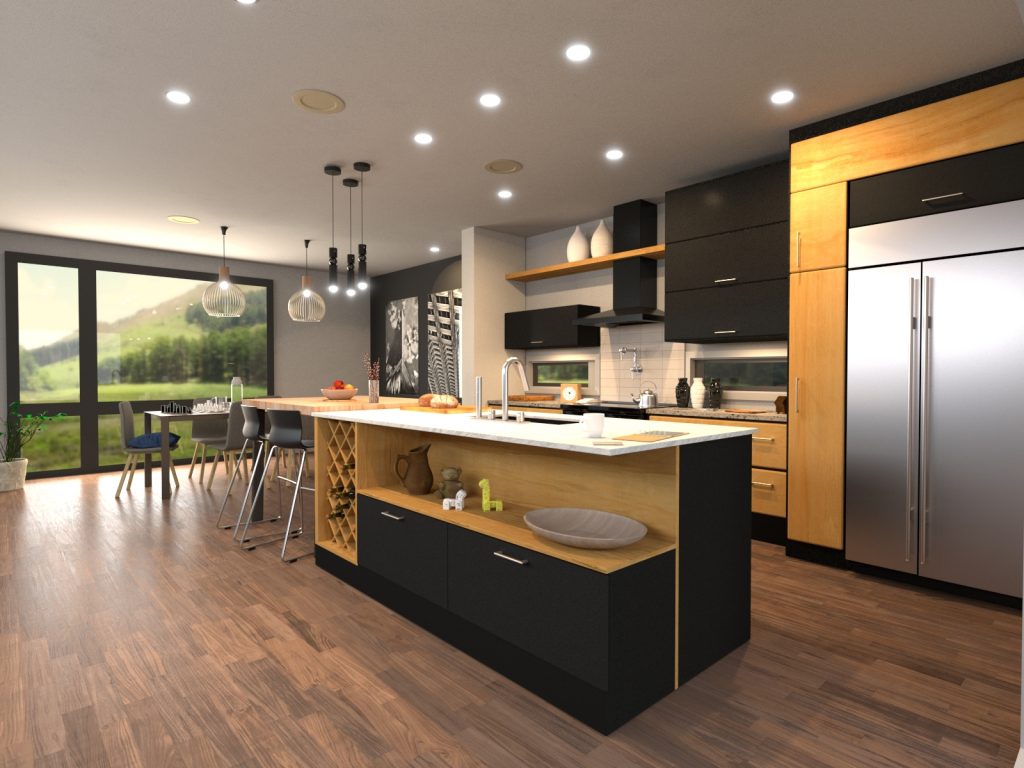 Voici une scène de visualisation architecturale. Faite à partir d’une photo d’une maison moderne à vendre, elle représente un banc d’essai pour faire une cuisine en 3D.