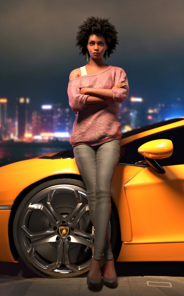Voici une scène où j’ai créé l’éclairage mettant en valeur l’asset Paris Women de l’Academy of Animated Art et à laquelle j’ai ajouté le modèle de voiture de Yorvin Luna Wisky et un modèle de trottoir de Quixel.